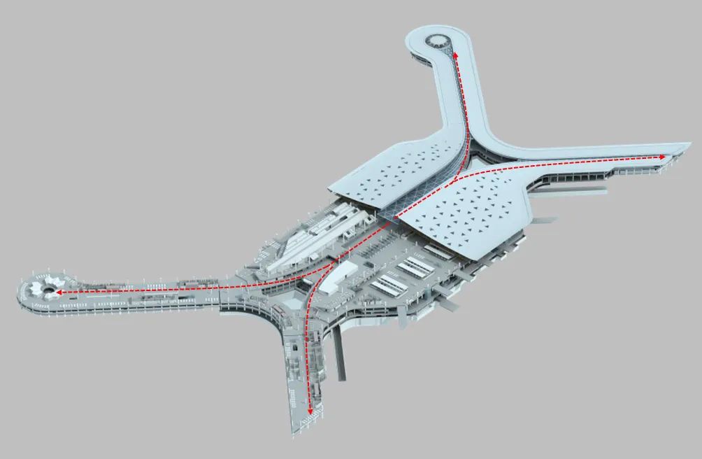 ▲ 剖面圖航站樓地上四層,地下一層。三層為出港層,二層為到達廊,首層為到港層。主樓局部設置四層和地下層。
