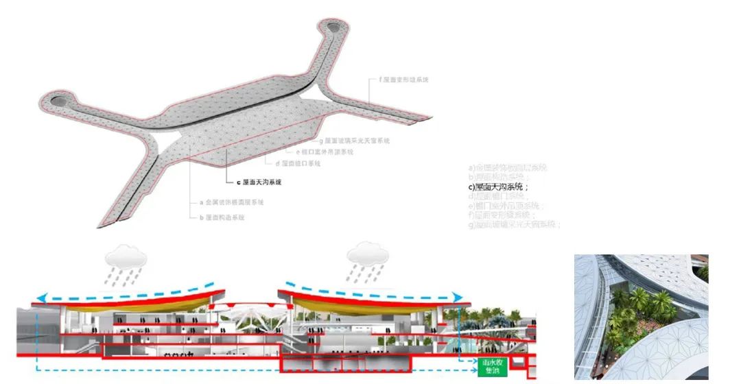 ▲ 直立鎖邊金屬屋面加裝飾板構造示意圖配合??诘锰飒毢竦臍夂驐l件,我們致力于打造一個綠色花園機場。除了樓內隨處可見的室內綠化,和兩處集中的室外景觀庭院,我們還結合??谶m宜的氣候和T1航站樓的經驗,在到達區域設計了開敞到達廊和景觀帶,既有利于全樓的節能,也充分體現了熱帶機場的特色。