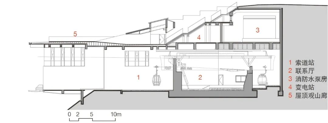 在兩個結束區集中應用迭臺形式之外,索道A、B線路各設置有中間站,A線路中站海拔標高1041m,是延慶冬奧村到集散廣場之間轉角站(圖32),B線路中站(即中間平臺,同時也設有C線路下站,在此由B換乘C至山頂出發區)海拔高度1554m,是集散廣場到競技結束區的轉角站(圖33)。設計將中間站視作集散廣場的“延伸”,形式選擇上也將其整合到上述策略中去。